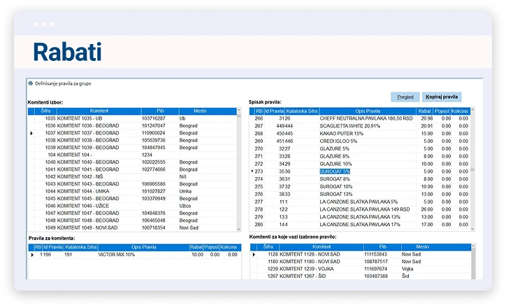 Definisanje rabata za razne vrste artikala, količinu, vrednost.