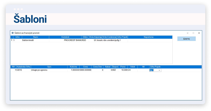 Mogućnost kreiranja šablona za knjiženje ugovora, kredita, lizinga i ostalih tipova dokumenata.