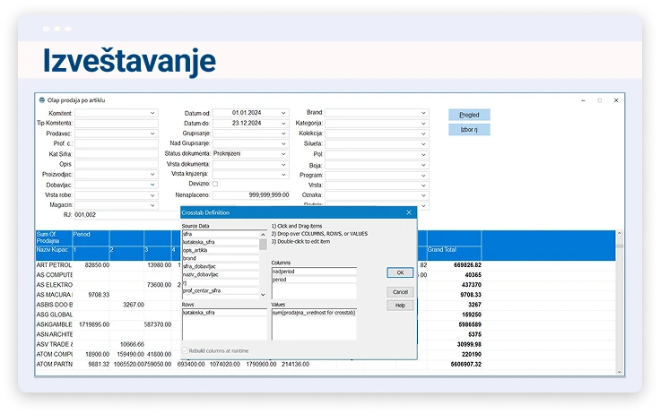 Filtriranje, sortiranje i sumiranje podataka prema zadatim atributima i po vremenskim okvirima.